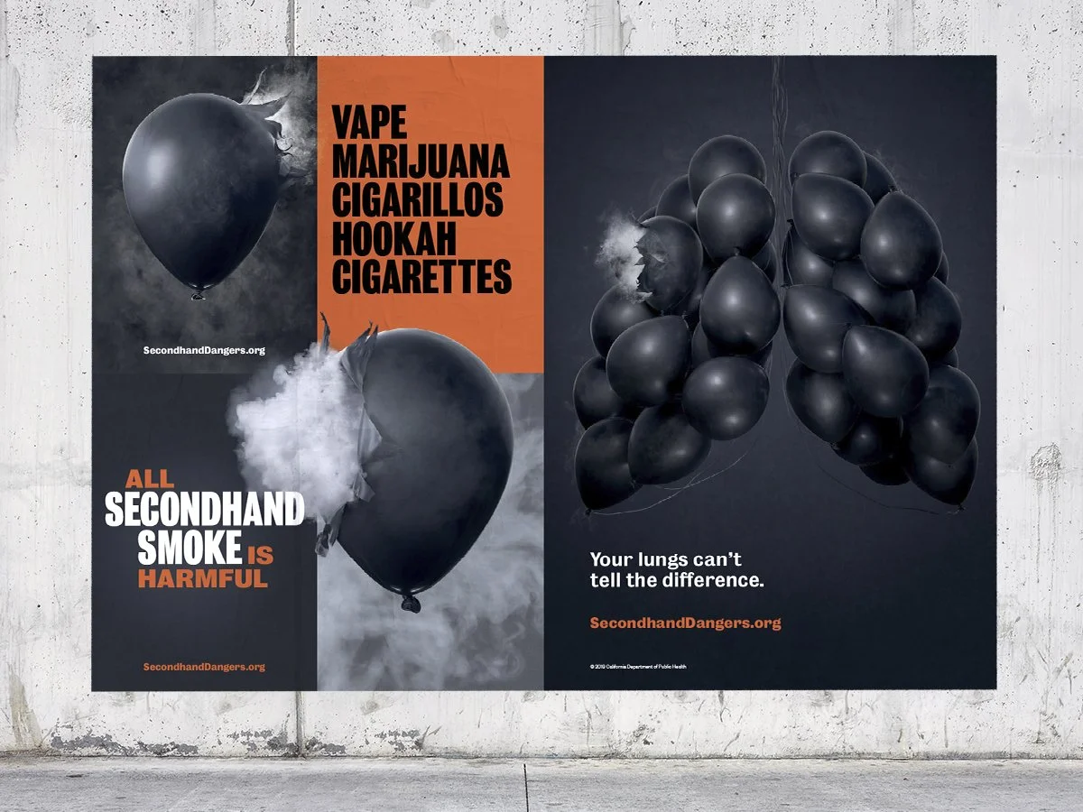 Californians are faced with secondhand cigarette, vape, and marijuana smoke everyday — and it's all harmful. Using the visual metaphor of a dark balloon, we wanted to show the prevalence of secondhand smoke in everyday situations.